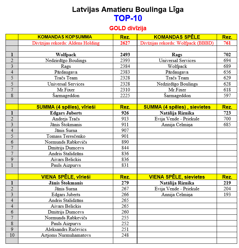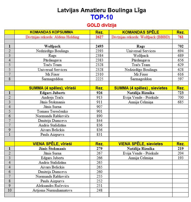 | 26 | Wolfpack | Edgars Juberts | 212,04 | 192,00 | 202,93 | 199,26 | 44 | 251 | 266 | 254 | 211 | 278 | 926 | 871 | 786 | 926 |