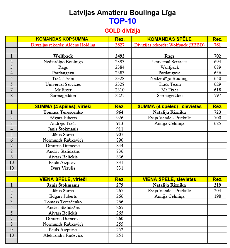 - TMRE – 2550 (19.ABL 2.k.) – 02.12.2024 /Iepriekšējais rekords: 2526 (9.ABL 1.k.) – RR Dziednieks v TMRE Revolution (TK 12, Atriebības Blice) | www.VissParBoulingu.lv/;
