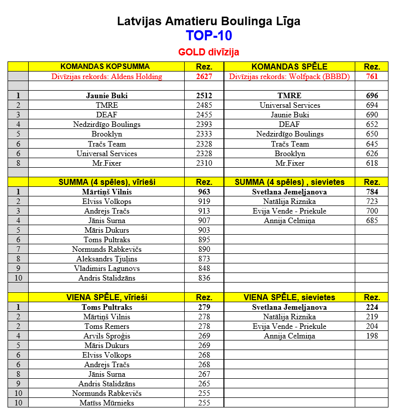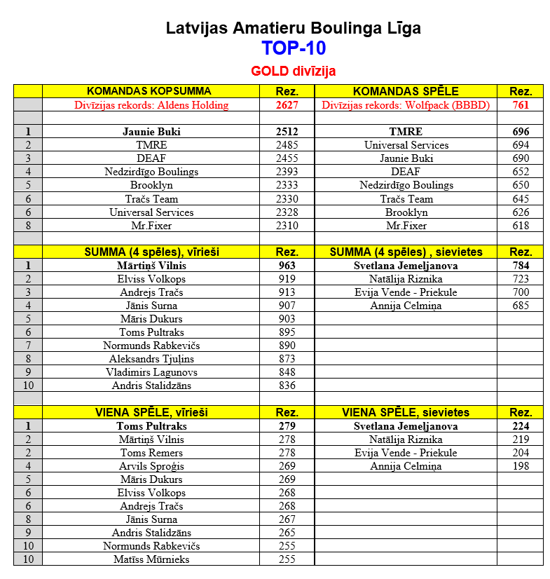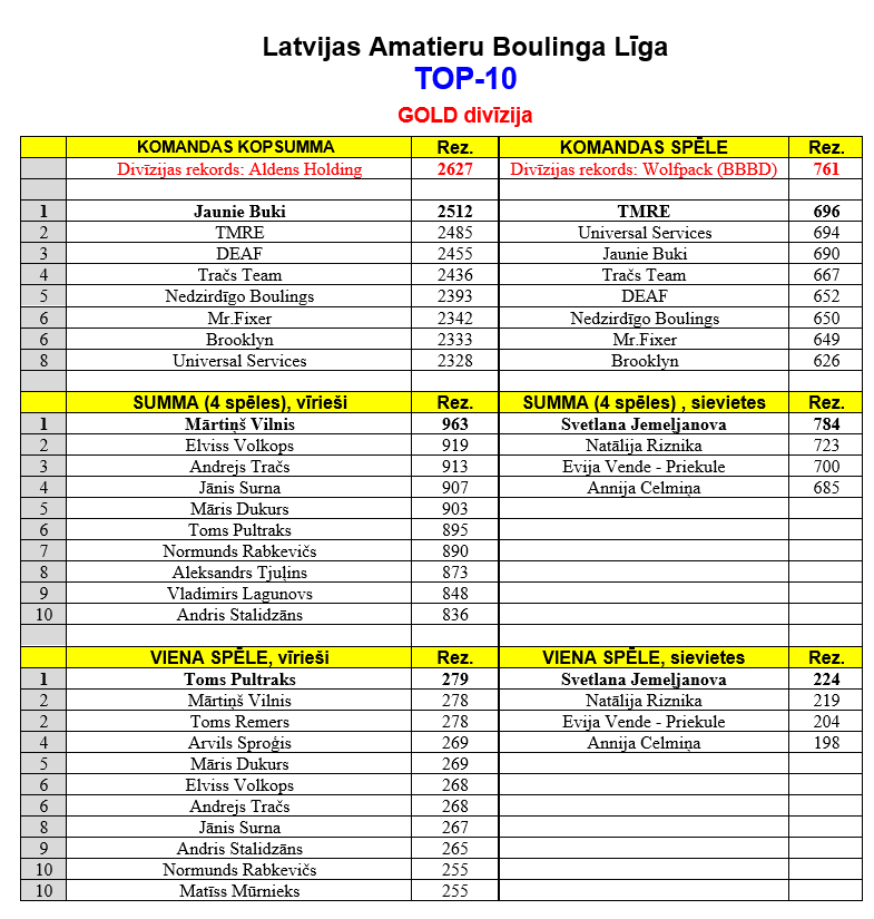 Spēlētāju Rekordi 2.kārtā: /ŠĪS SEZONAS REKORDI/ Vīriešu konkurence: Jauns 1 spēles Individuālais rekords: Jauns 4 spēļu Individuālais rekords: Sieviešu konkurence: Jauns 1 spēles Individuālais rekords: Jauns 4 spēļu Individuālais rekords: |